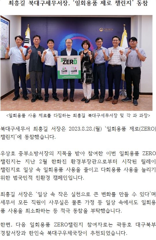 최흥길 북대구세무서장, '일회용품 제로 챌린지' 동참