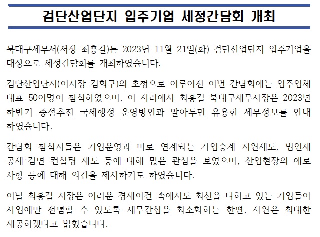북대구세무서 검단산업단지 입주기업 세정간담회 개최