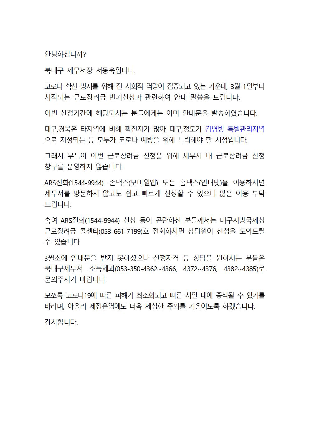 북대구 세무서장 안내말씀(근로장려금 신청관련 안내문)