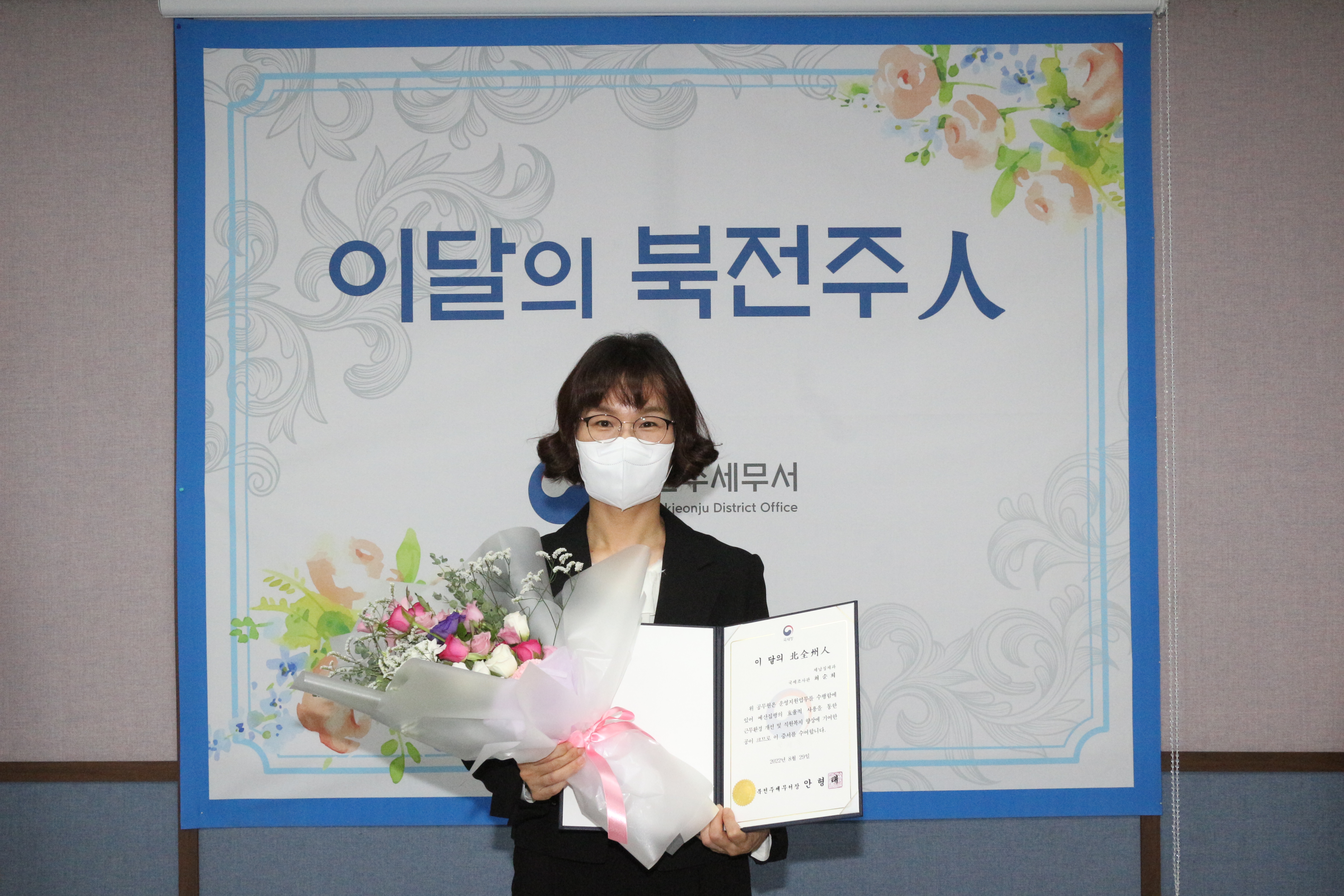 북전주세무서(서장 안형태)는 직원들의 사기진작을 위해 매월 '이달의 북전주인'을 선정하고 있습니다. 이번 달에는 운영지원업무를 수행함에 있어 예산집행의 효율적 사용을 통한 근무환경 개선 및 직원복지 향상에 기여한 공이 큰 운영지원팀 최순희 조사관님이 선정되었습니다.
