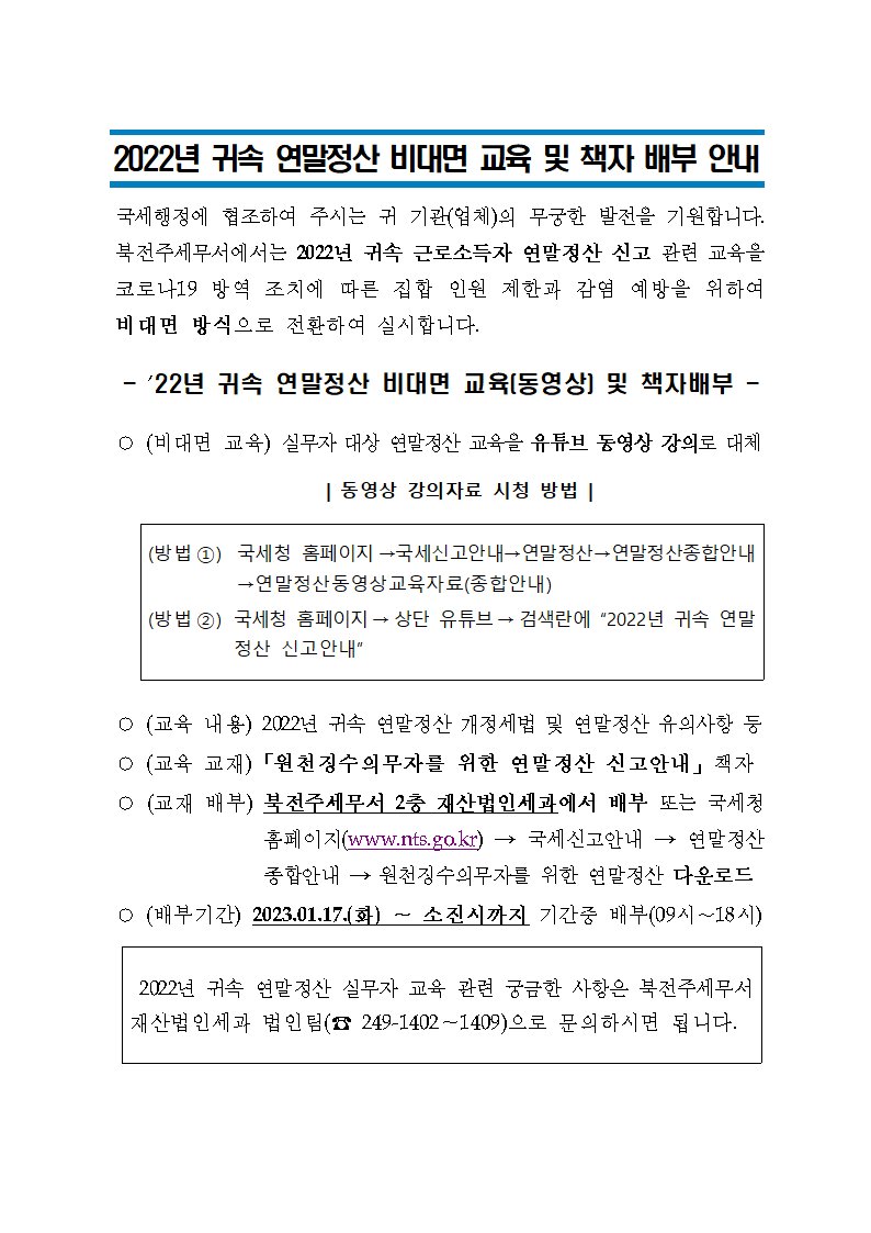 2022년 귀속 연말정산 비대면 교육 및 책자 배부 안내
