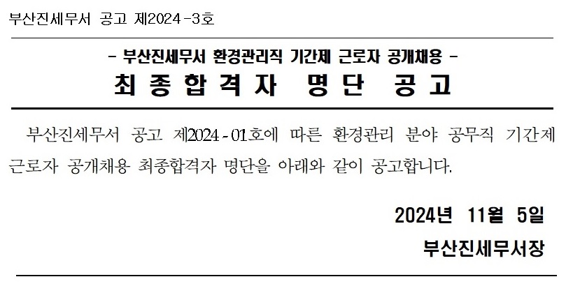 부산진세무서 기간제 근로자[환경관리] 공개채용 최종합격자 명단 공고