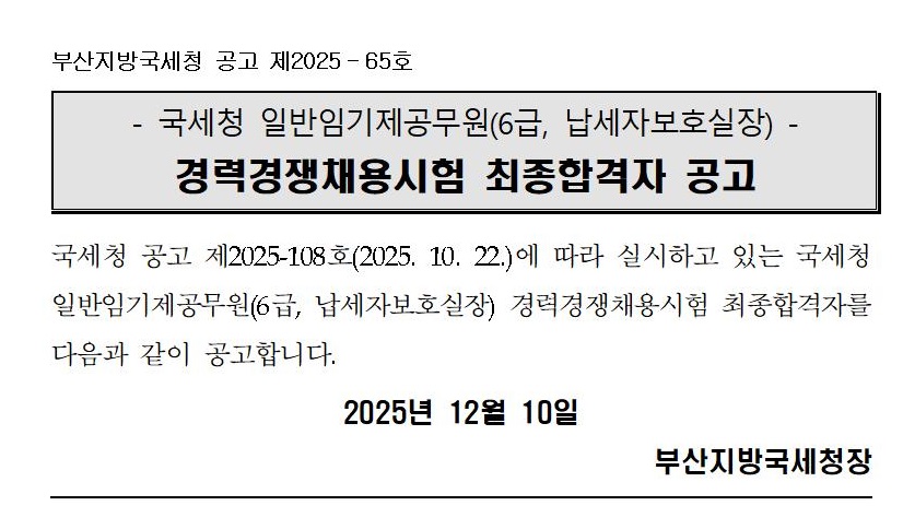 부산지방국세청 일반임기제공무원(6급, 세무서 납보실장) 경력경쟁채용 최종합격자 공고.hwp