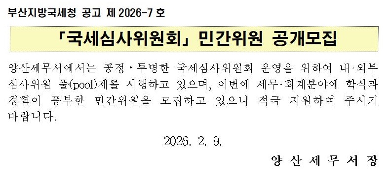 양산세무서 「국세심사위원회」민간위원 공개모집