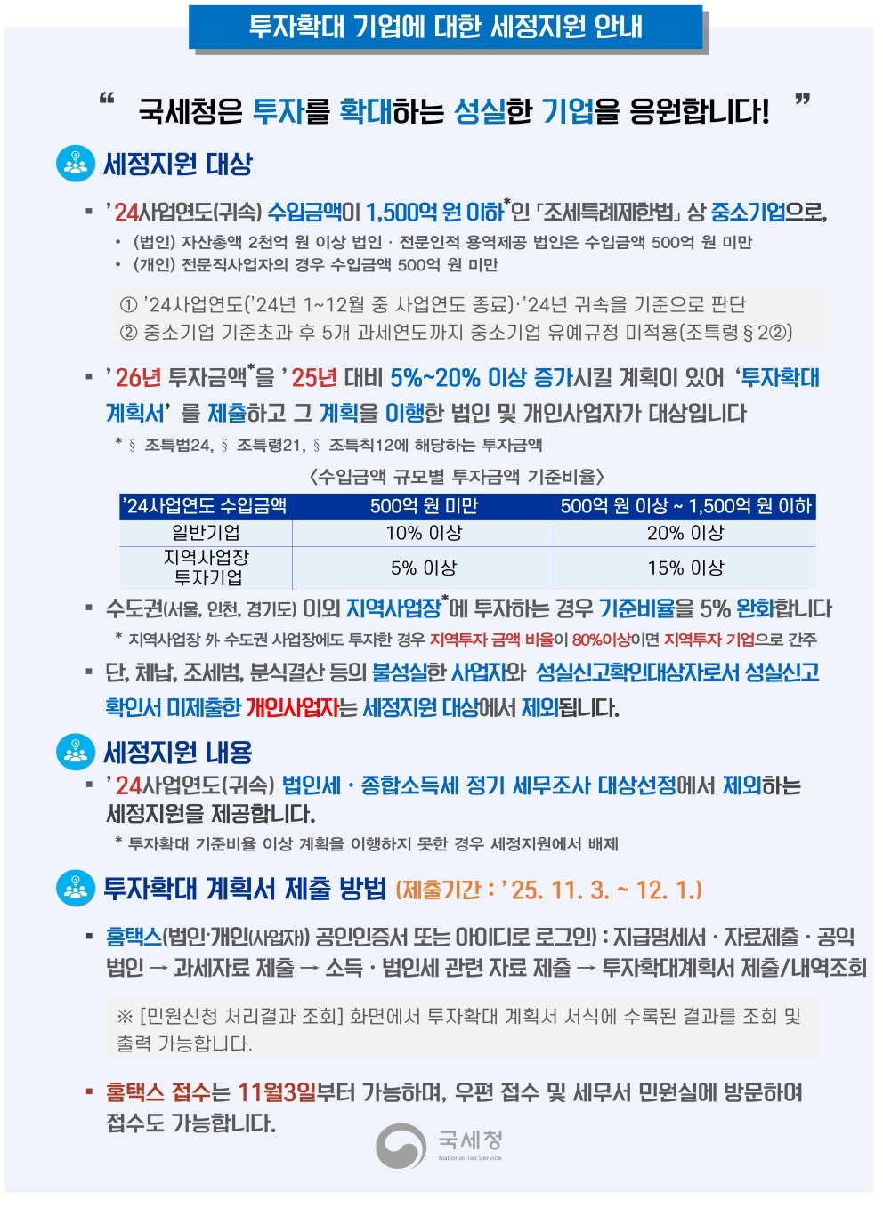 공지사항 첨부1_투자확대 기업에 대한 세정지원 안내(안)_2025년.hwpx