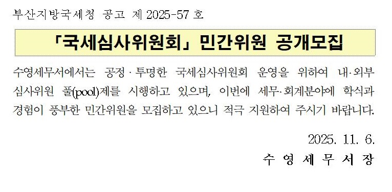 수영세무서 「국세심사위원회」민간위원 공개모집