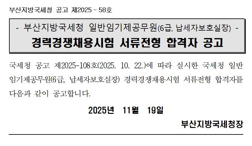 부산지방국세청 일반임기제공무원(6급,납세자보호실장) 서류전형 합격자 공고