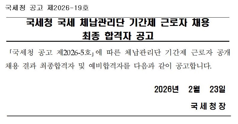 국세청 국세 체납관리단 기간제 근로자 채용 최종 합격자 공고(공고2026-19호).pdf
