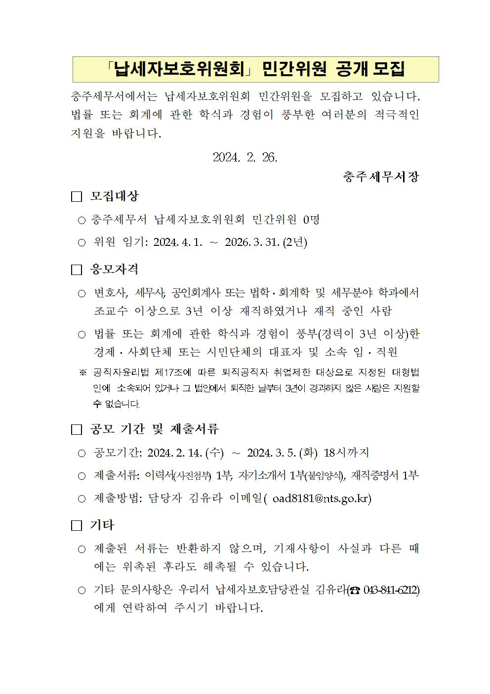 충주세무서 납세자보호위원회 민간위원 공개모집