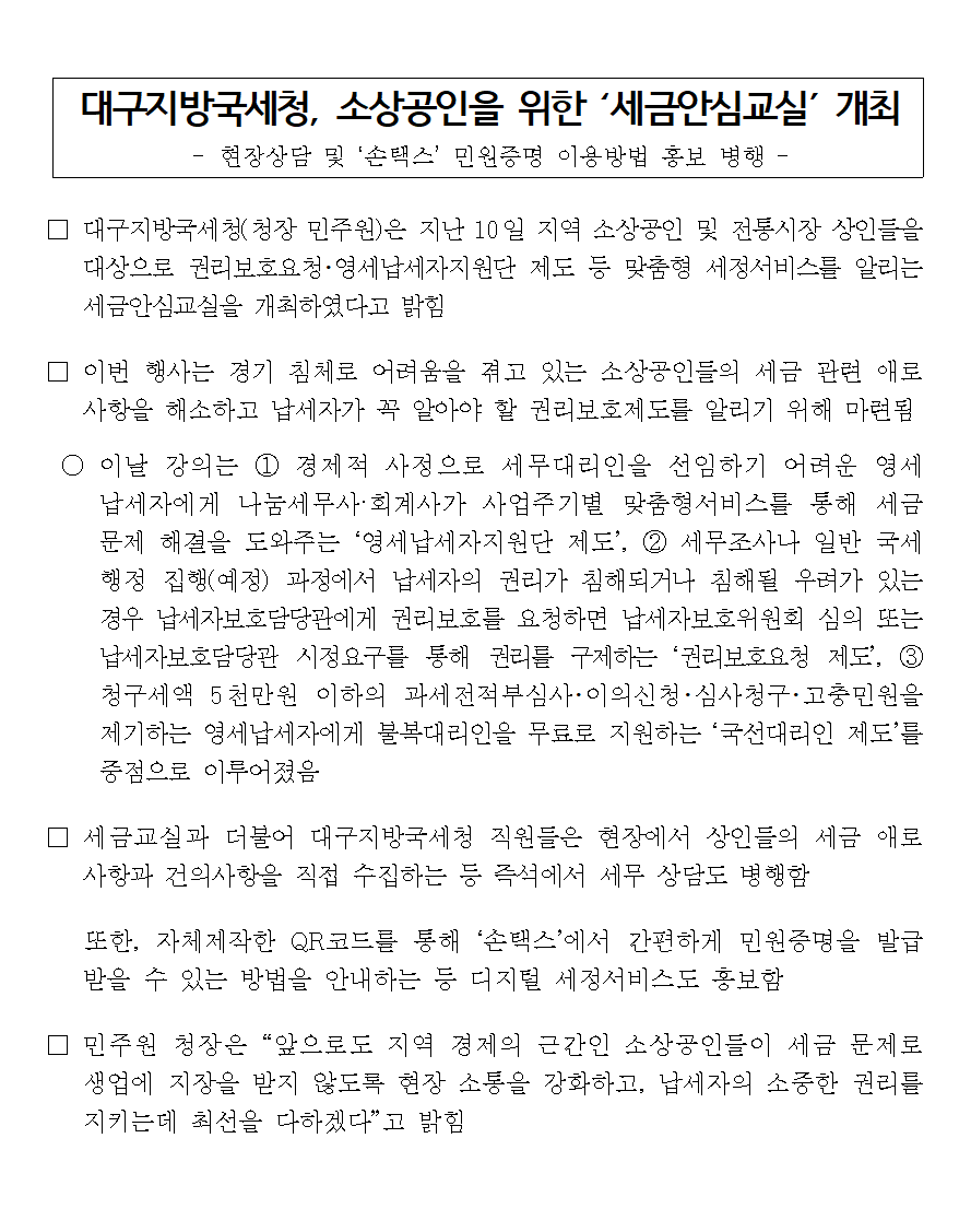 대구지방국세청, 소상공인을 위한 '세금안심교실' 개최
