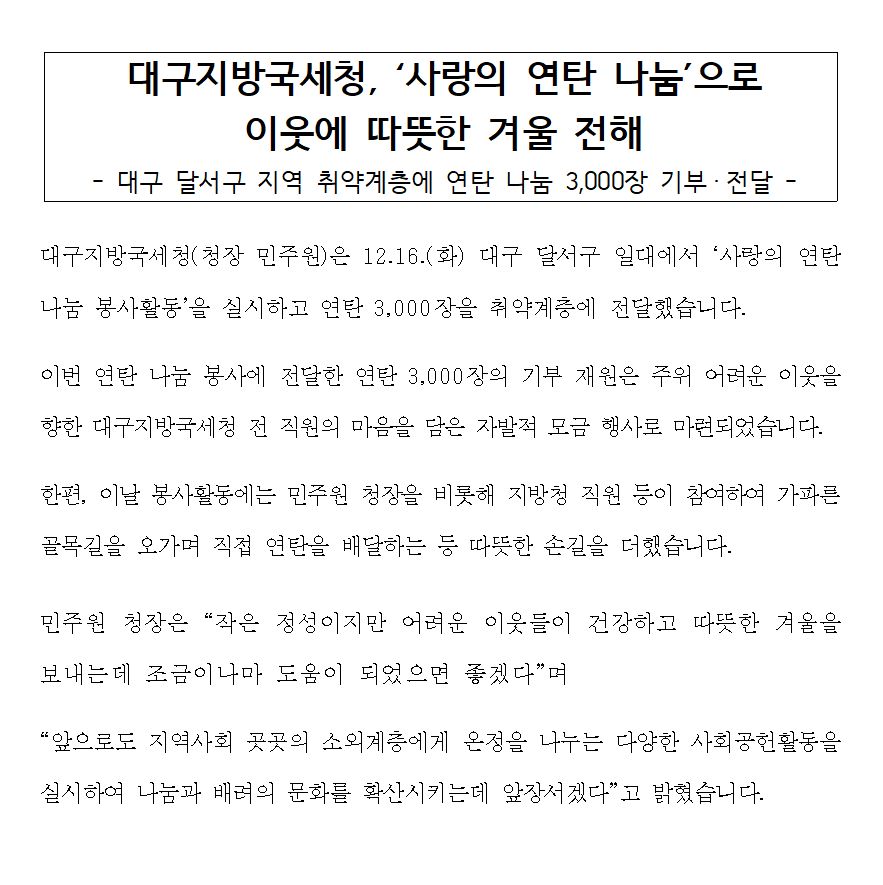 대구지방국세청, ‘사랑의 연탄 나눔’