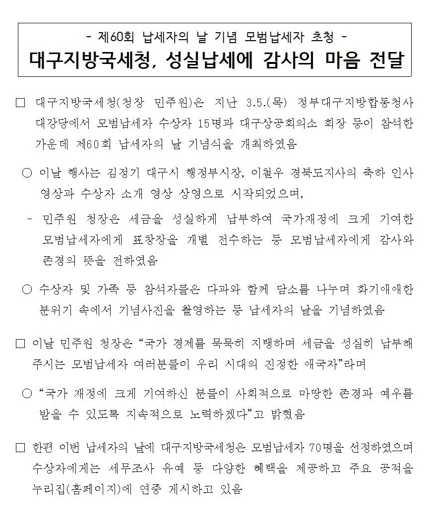 대구지방국세청, 성실납세에 감사의 마음 전달