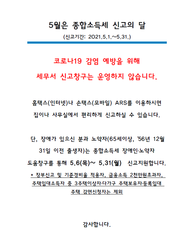 코로나19 감염 예방을 위해 세무서 신고창구는 운영하지 않습니다. 홈택스(인터넷)나 손택스(모바일) ARS 이용하시면 집이나 사무실에서 편리하게 신고하실 수 있습니다. 단, 장애가 있으신 분과 노약자(65세 이상, 56년 12월 31일 이전 출생자)는 종합소득세 장애인 노약자 도움창구를 통해 5.6부터 5.31 신고지원 합니다.