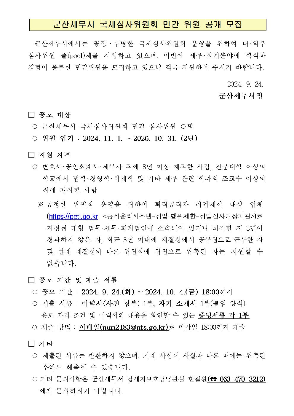 국세심사위원회 민간위원 공개모집 공고문- 군산세무서.hwpx