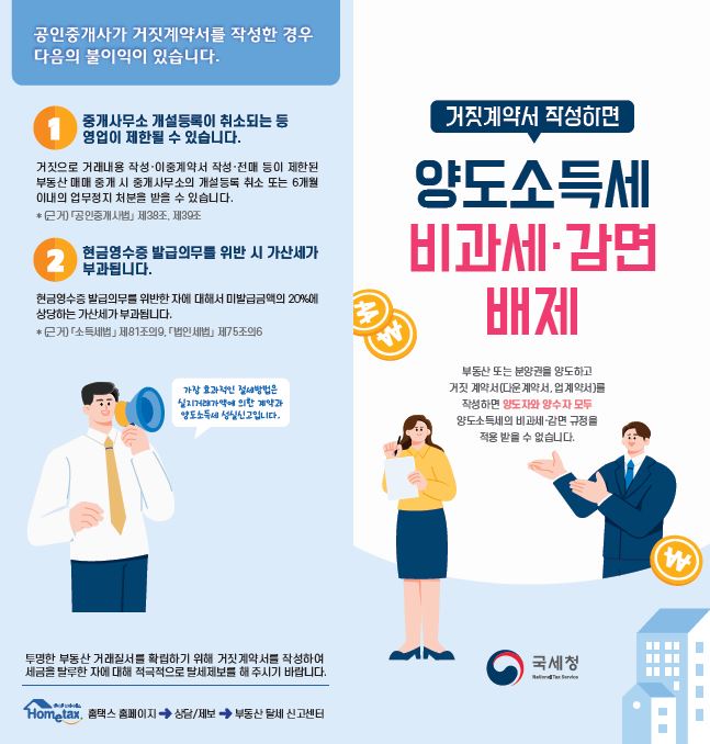 거짓계약서 작성 시 양도소득세 비과세·감면 배제 등 불이익에 관한 사항을 안내드립니다.