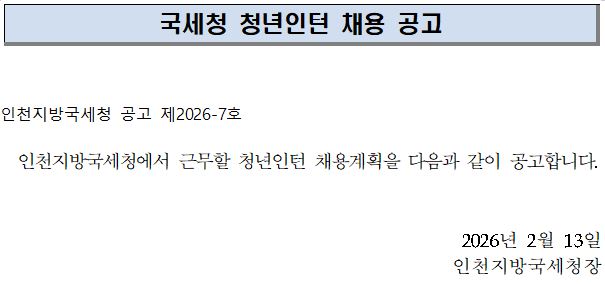 인천지방국세청 청년인턴 채용관련하여 공고하오니 자세한 내용은 첨부파일 확인부탁드립니다.