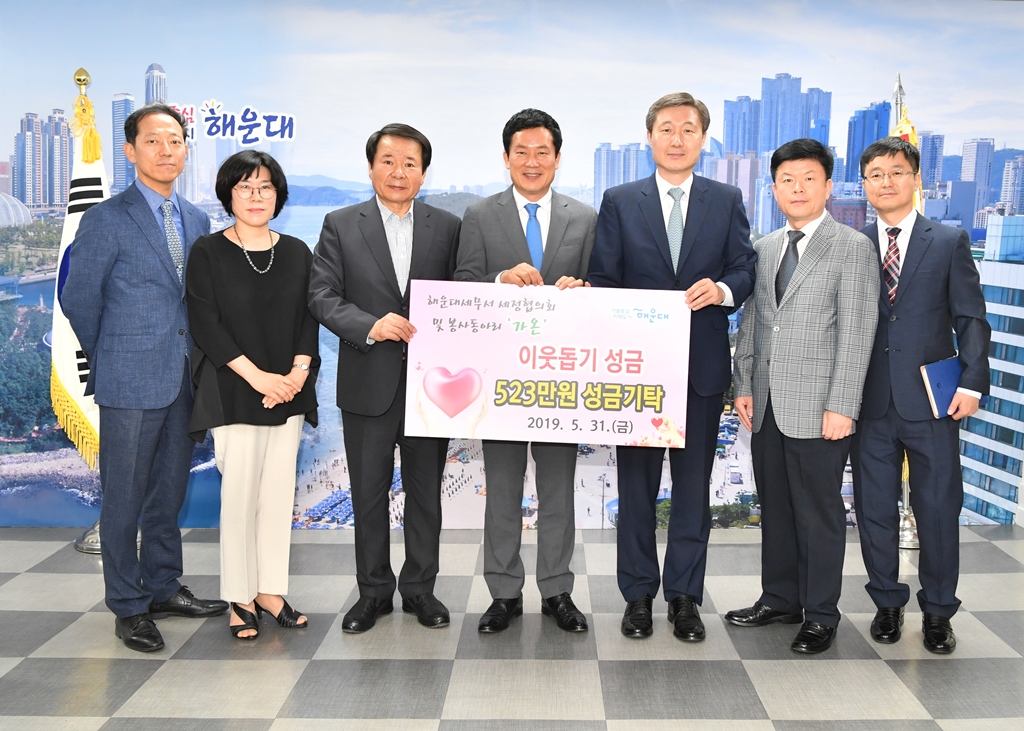 해운대세무서(서장 이준홍) 세정협의회 및 봉사동아리 '가온'에서는 2019.05.31.(금) 해운대구청을 통해 이웃돕기 성금 523만원을 기탁하였습니다. 앞으로도 지속적인 사회공헌으로 희망나눔을 실천하는 해운대세무서가 되겠습니다.
