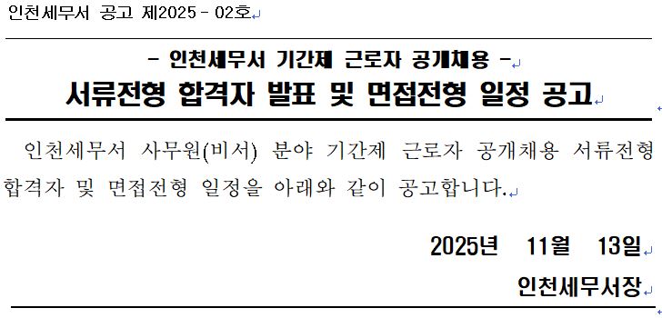 인천세무서 기간제 근로자 채용 서류전형 합격자 발표 및 면접전형 일정 공고