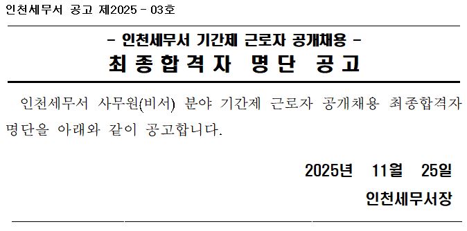 인천세무서 기간제 근로자 최종합격자 명단 공고