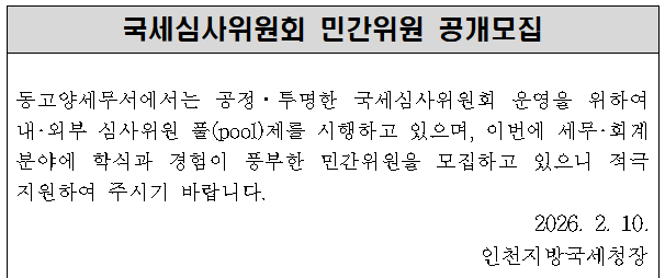 국세심사위원회 민간위원 공개모집 동고양세무서에서는 공정ㆍ투명한 국세심사위원회 운영을 위하여 내‧외부 심사위원 풀(pool)제를 시행하고 있으며, 이번에 세무‧회계분야에 학식과 경험이 풍부한 민간위원을 모집하고 있으니 적극 지원하여 주시기 바랍니다. 2026. 2. 10. 인천지방국세청장