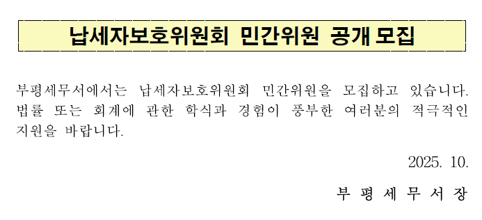 납세자보호위원회 민간위원 공개 모집 부평세무서에서는 납세자보호위원회 민간위원을 모집하고 있습니다. 법률 또는 회계에 관한 학식과 경험이 풍부한 여러분의 적극적인 지원을 바랍니다. 2025. 10. 부평세무서장
