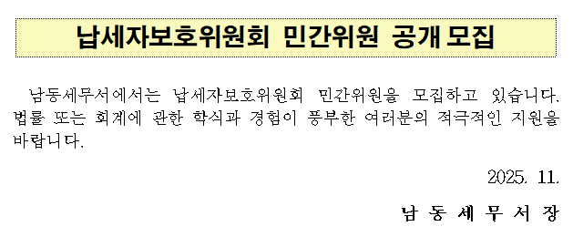 납세자보호위원회 민간위원 공개모집 남동세무서에서는 납세자보호위원회 민간위원을 모집하고 있습니다. 법률 또는 회계에 관한 학식과 경험이 풍부한 여러분의 적극적인 지원을 바랍니다. 2025. 11. 남 동 세 무 서 장