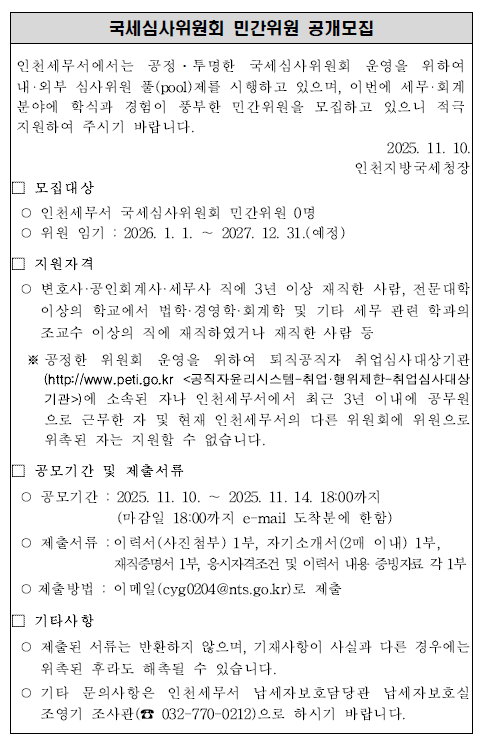 인천세무서에서는 공정ㆍ투명한 국세심사위원회 운영을 위하여 내‧외부 심사위원 풀(pool)제를 시행하고 있으며, 이번에 세무‧회계분야에 학식과 경험이 풍부한 민간위원을 모집하고 있으니 적극 지원하여 주시기 바랍니다.