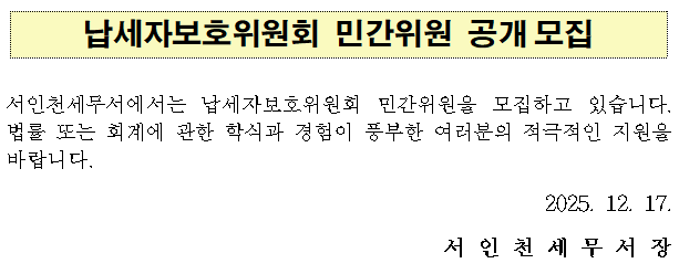 납세자보호위원회 민간위원 공개모집 서인천세무서에서는 납세자보호위원회 민간위원을 모집하고 있습니다. 법률 또는 회계에 관한 학식과 경험이 풍부한 여러분의 적극적인 지원을 바랍니다. 2025. 12. 17. 서 인 천 세 무 서 장
