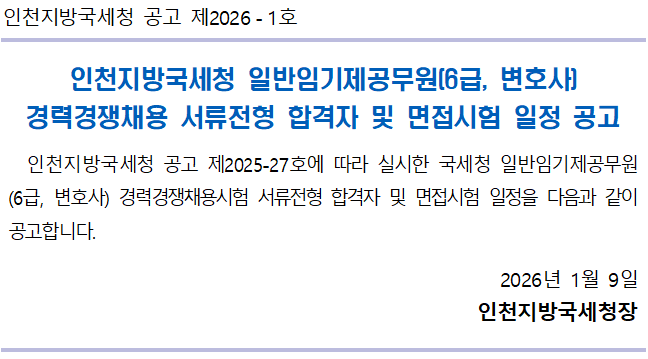 인천지방국세청 공고 제2026-1호 인천지방국세청 일반임기제공무원(6급, 변호사) 경력경쟁채용 서류전형 합격자 및 면접시험 일정 공고 인천지방국세청 공고 제2025-27호에 따라 실시한 국세청 일반임기제공무원(6급, 변호사) 경력경쟁채용시험 서류전형 합격자 및 면접시험 일정을 다음과 같이 공고합니다. 2026년 1월 9일 인천지방국세청장