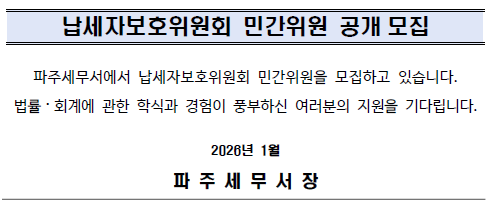 납세자보호위원회 민간위원 공개 모집 파주세무서에서 납세자보호위원회 민간위원을 모집하고 있습니다. 법률 회계에 관한 학식과 경험이 풍부하신 여러분의 지원을 기다립니다. 2026년 1월 파주세무서장