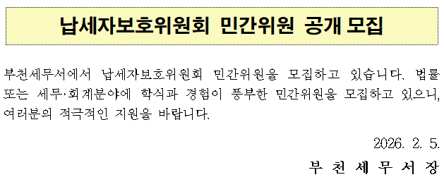 납세자보호위원회 민간위원 공개모집 부천세무서에서 납세자보호위원회 민간위원을 모집하고 있습니다. 법률 또는 세무·회계분야에 학식과 경험이 풍부한 민간위원을 모집하고 있으니, 여러분의 적극적인 지원을 바랍니다. 2026. 2. 5. 부 천 세 무 서 장