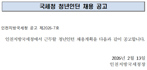 국세청 청년인턴 채용 공고 인천지방국세청 공고 제2026-7호 인천지방국세청에서 근무할 청년인턴 채용계획을 다음과 같이 공고합니다. 2026년 2월 13일 인천지방국세청장