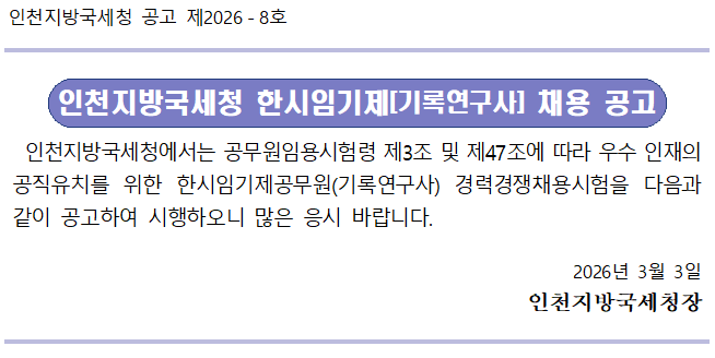 인천지방국세청 공고 제2026-8호 인천지방국세청 한시임기제[기록연구사] 채용 공고 인천지방국세청에서는 공무원임용시험령 제3조 및 제47조에 따라 우수 인재의 공직유치를 위한 한시임기제공무원(기록연구사) 경력경쟁채용시험을 다음과 같이 공고하여 시행하오니 많은 응시 바랍니다. 2026년 3월 3일 인천지방국세청장