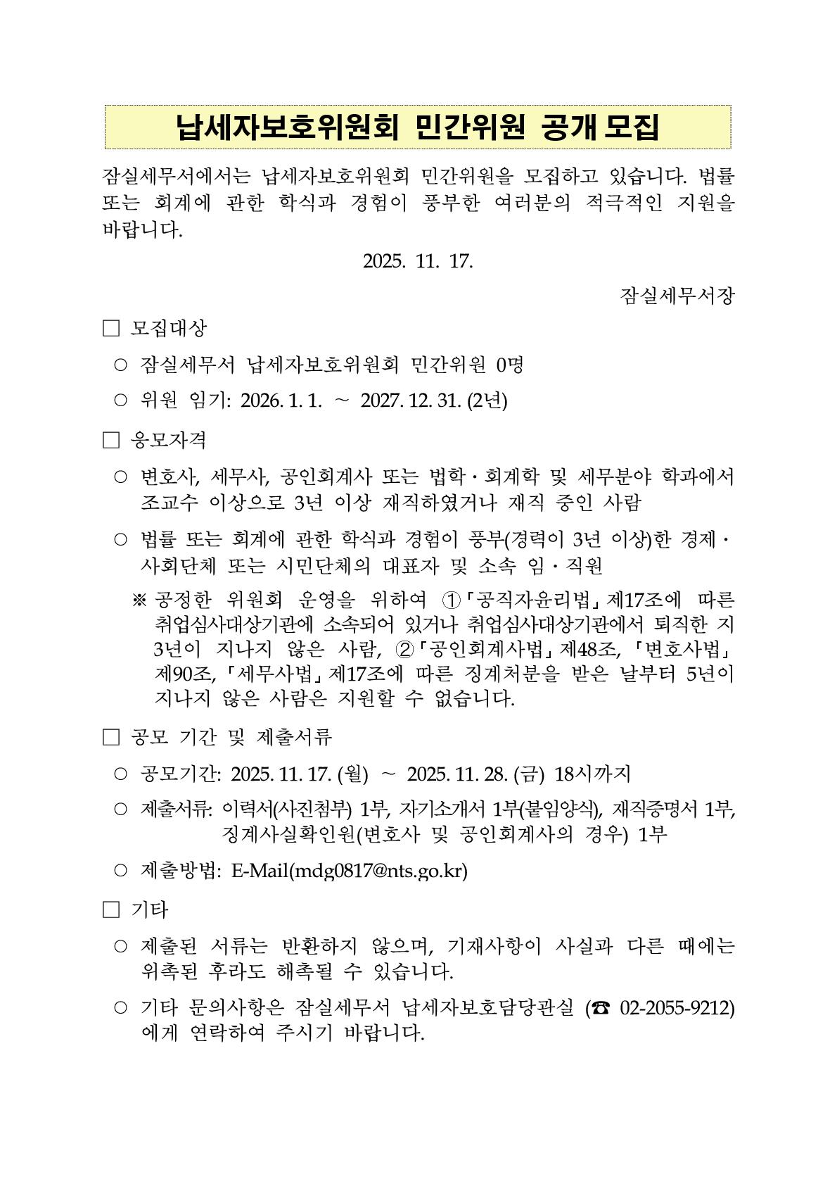 1. 잠실세무서 납세자보호위원회 민간위원 공개모집 공고문.hwpx