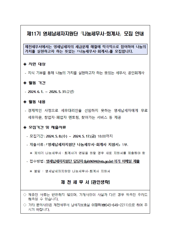 제11기 영세납세지원단 「나눔세무사・회계사」 모집 안내
