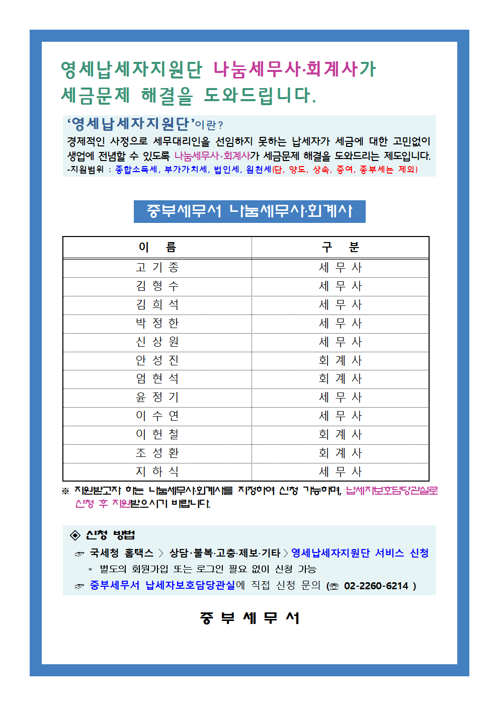 중부세무서 영세납세자지원단 나눔세무사·회계사 명단