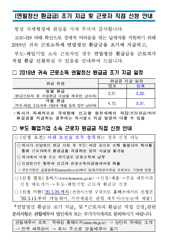 2019년 귀속 연말정산 환급금 조기지급 및 신청안내