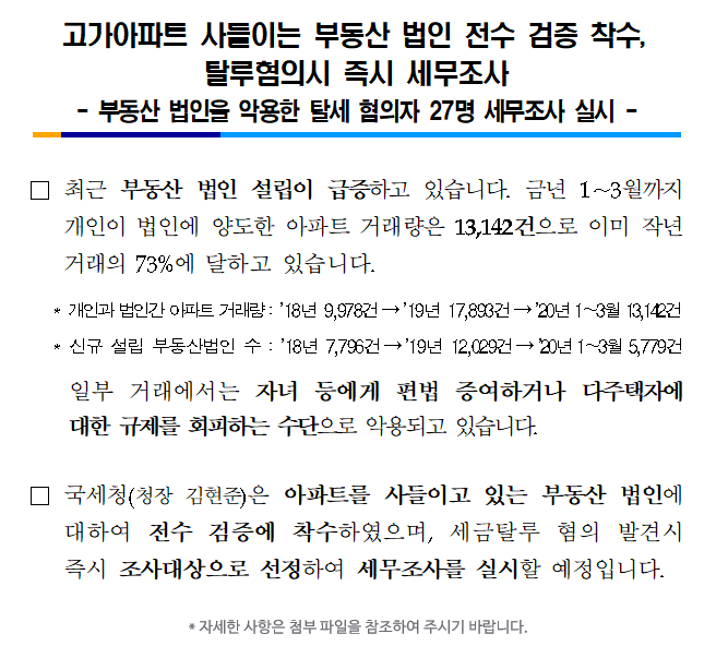 고가아파트 사들이는 부동산 법인 전수 검증 착수_ 탈루혐의시 즉시 세.hwp