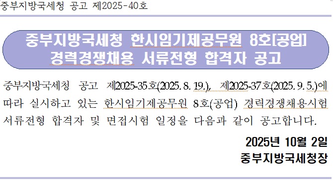 중부지방국세청 공고 제2025-40호 중부지방국세청 한시임기제공무원 8호[공업] 경력경쟁채용 서류전형 합격자 공고 중부지방국세청 공고 제2025-35호(2025.8.19.), 제2025-37호(2025.9.5.)에 따라 실시하고 있는 한시임기제공무원 8호(공업) 경력경쟁채용시험 서류전형 합격자 및 면접시험 일정을 다음과 같이 공고합니다. 2025년 10월 2일 중부지방국세청장