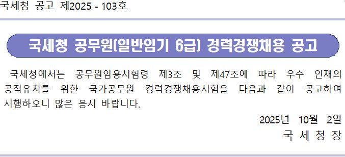국세청 공고 제2025-103호 국세청 공무원(일반임기 6급) 경력경쟁채용 공고 국세청에서는 공무원임용시험령 제3조 및 제47조에 따라 우수 인재의 공직유치를 위한 국가공무원 경력경쟁채용시험을 다음과 같이 공고하여시행하오니 많은 응시 바랍니다. 2025년 10월 2일 국 세 청 장