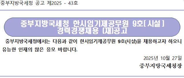 중부지방국세청 공고 제2025 - 43호 중부지방국세청 한시임기제공무원 9호[시설] 경력경쟁채용 (재)공고 중부지방국세청에서는 다음과 같이 한시임기제공무원 9호(시설)을 채용하고자 하오니 유능한 인재의 많은 응모 바랍니다. 2025년 10월 27일 중부지방국세청장