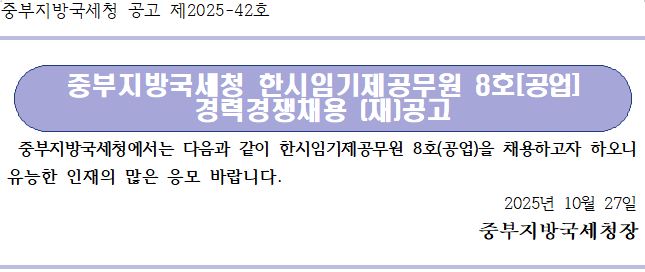 중부지방국세청 공고 제2025-42호 중부지방국세청 한시임기제공무원 8호[공업] 경력경쟁채용 (재)공고 중부지방국세청에서는 다음과 같이 한시임기제공무원 8호(공업)을 채용하고자 하오니 유능한 인재의 많은 응모 바랍니다. 2025년 10월 27일 중부지방국세청장