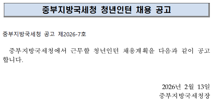 2026년 중부지방국세청 청년인턴 채용 공고