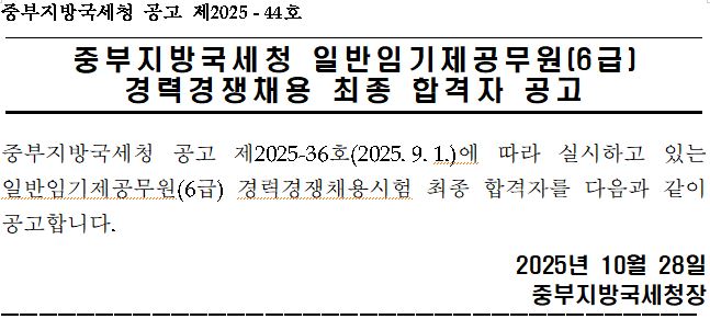 중부지방국세청 공고 제2025-44호 중부지방국세청 일반임기제공무원(6급) 경력경쟁채용 최종 합격자 공고 중부지방국세청 공고 제2025-36호(2025.9.1.)에 따라 실시하고 있는 일반임기제공무원(6급) 경력경쟁채용시험 최종 합격자를 다음과 같이 공고합니다. 2025년 10월 28일 중부지방국세청장