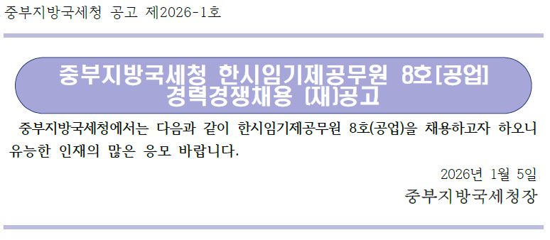 중부지방국세청 공고 제2026-1호 중부지방국세청 한시임기제공무원 8호[공업] 경력경쟁채용 (재)공고 중부지방국세청에서는 다음과 같이 한시임기제공무원 8호(공업)을 채용하고자 하오니 유능한 인재의 많은 응모 바랍니다. 2026년 1월 5일 중부지방국세청장