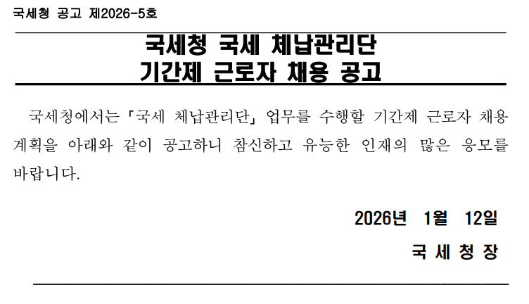 국세청 국세 체납관리단 기간제 근로자 채용 공고(공고2026-5호).hwp