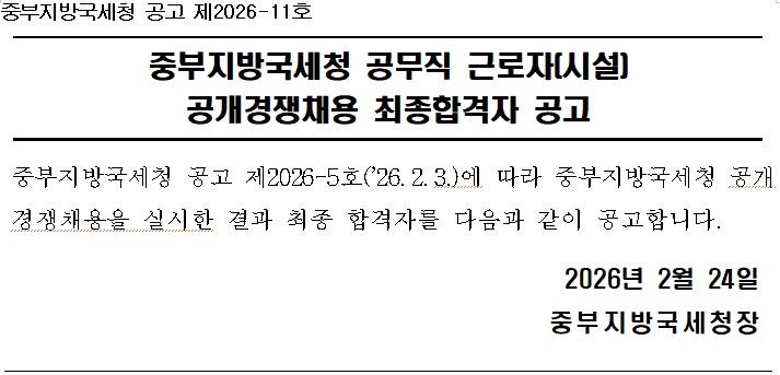 중부지방국세청 공고 제2026-11호 중부지방국세청 공무직 근로자(시설) 공개경쟁채용 최종합격자 공고 중부지방국세청 공고 제2026-5호(’26.2.3.)에 따라 중부지방국세청 공개경쟁채용을 실시한 결과 최종 합격자를 다음과 같이 공고합니다. 2026년 2월 24일 중부지방국세청장