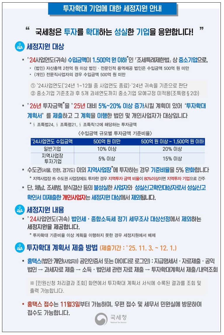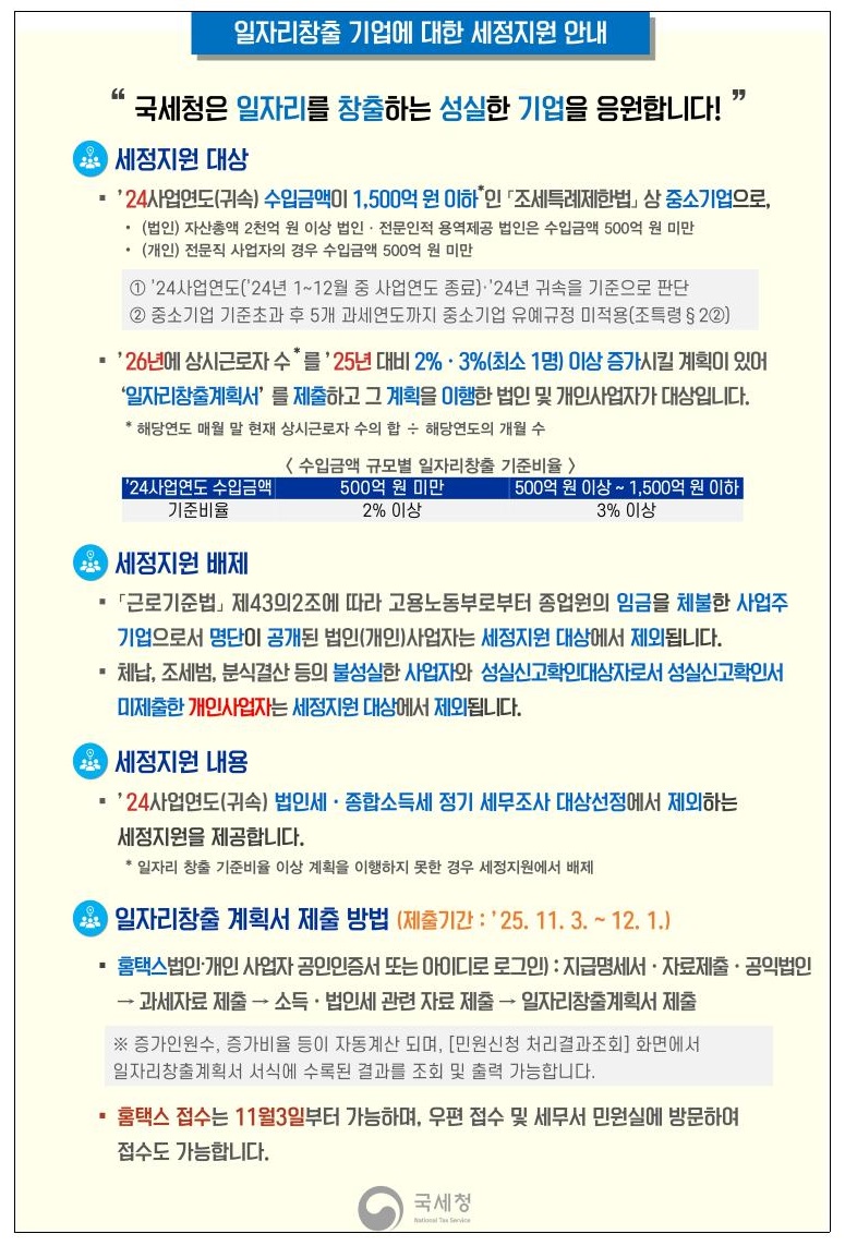 일자리창출 기업 및 투자확대 법인 세정지원 안내