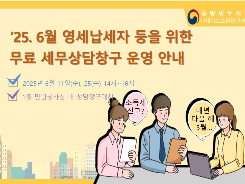 중랑세무서에서 6월 「무료세무상담창구」를 운영하게 되어 일정을 공지하오니,