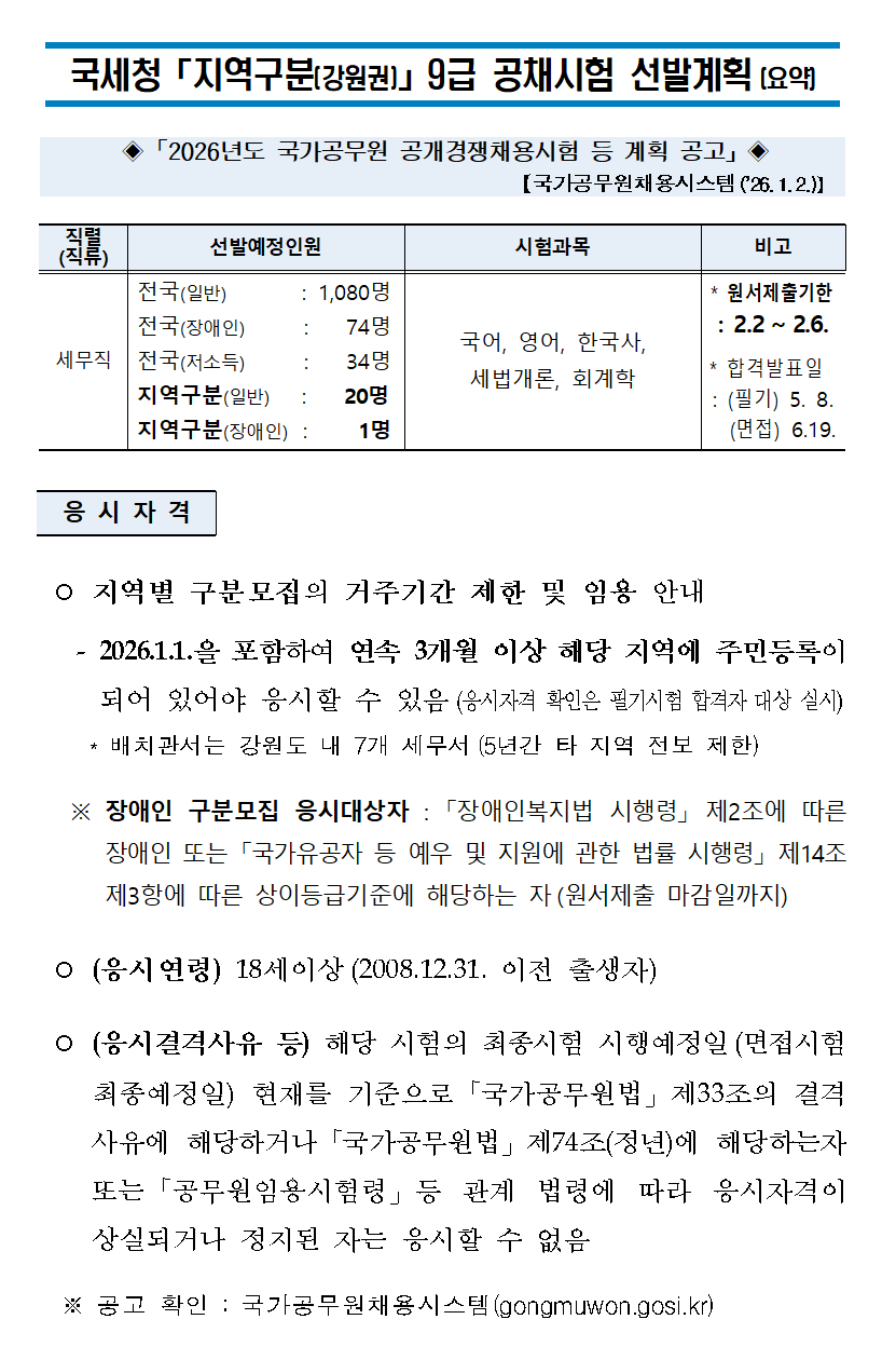 국세청 강원권 지역구분 9급 공채시험 선발계획(요약)